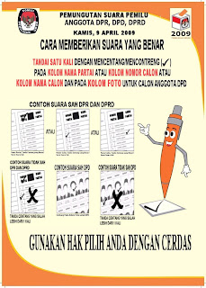 Alow temen-temen, ini hari Pemilu lesgislatif 2009 nih. Udah pada nyontreng belom?? Buat kita2 yang di Jakarta, dikasih 3 surat suara, buat DPR, DPRD, dan DPD. Gw sendiri baru abis pulang nyontreng nih.
